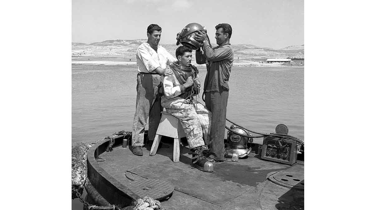 في عام 1952م، كان تجهيز غواص واحد بمعدّات الغوص المناسبة يتطلب جهدًا جماعيًا. في هذه الصورة يبدو الغواص آرثر ف. بيلي وهو يستعد لإجراء إصلاحات على خطوط التغذية تحت الماء التي تربط منطقة التخزين الساحلية لشركة "ترانز آريبيان بايبلاين" بالناقلات الراسية في البحر.