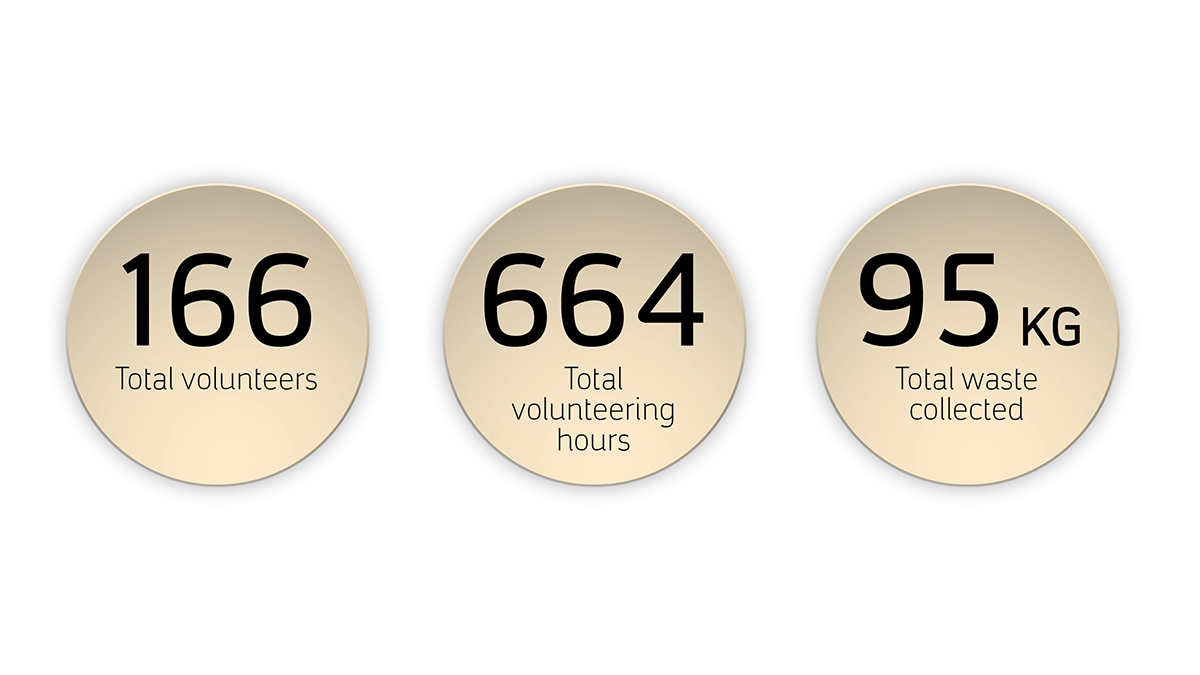 Over 1,200 employee volunteering requests for the 2-day event were submitted, only within 24 hours of opening the registration. However, due to COVID-19 restrictions, a limited number of participants were confirmed. The campaign received a total of 166 volunteers including both employees and their dependents, with 664 volunteering hours – collecting 95 kilograms of waste.