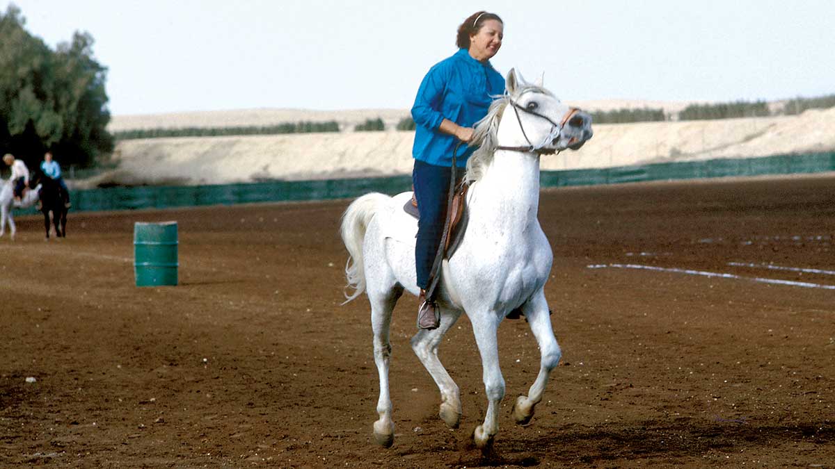 Horses have been an important part of Arabian culture for millennia, so it was natural when residential camps developed around oil operations to turn to horses for recreation. Here, a woman gallops her horse at the Hobby Farm in Dhahran in January 1964. Aramco and horses came together in 1940. Local police were using the animals to patrol the oil facilities, and S.F. Furman, who was in charge of a small farm raising food for employees, was asked to care for an injured steed.