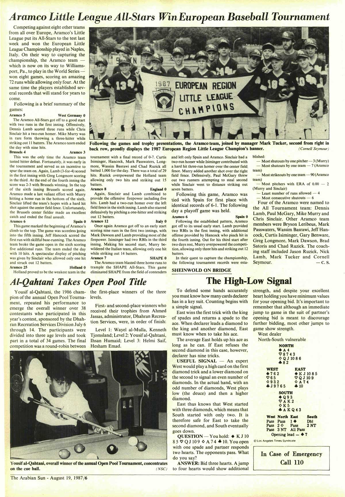 Yousif al-Qahtani, the 1986 champion of the Open Pool Tournament, repeated his performance to emerge the overall winner over 38 contestants who participated in this year's contest, sponsored by the Dhahran Recreation Service Division, July 6 through 14.