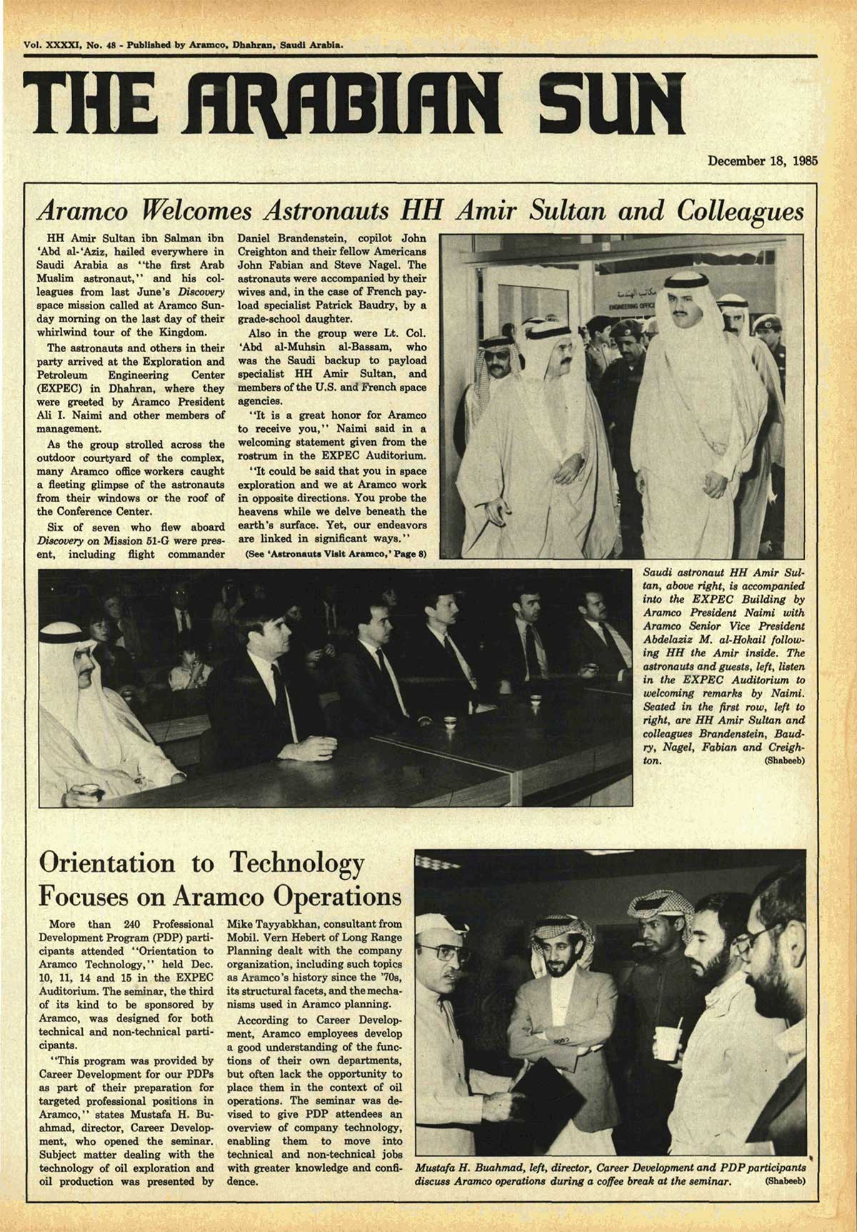 HH Amir Sultan ibn Salman ibn 'Abd al-'Aziz, hailed everywhere in Saudi Arabia as "the first Arab Muslim astronaut," and his colleagues from last June's Discovery space mission, called at Aramco Sunday morning on the last day of their whirlwind tour of the Kingdom.