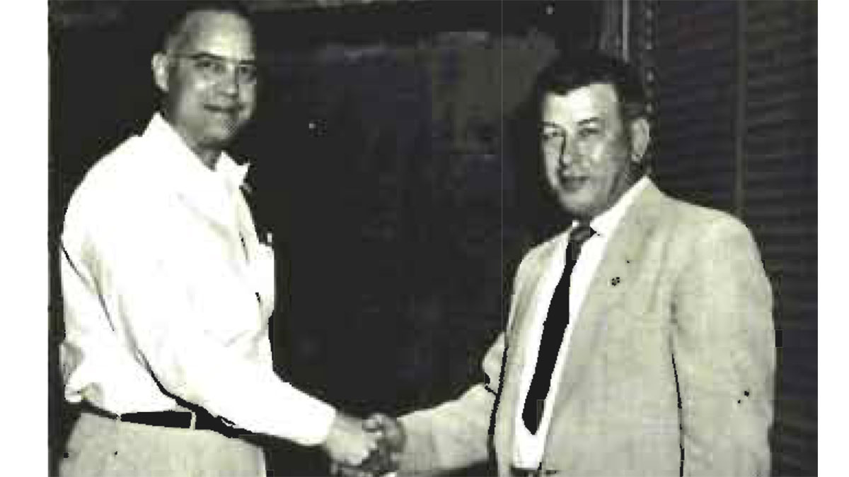 Caption for top photo: John Pokryska, right, is congratulated by Abqaiq's District Manager D.N. Ezzell on receiving on Aramco Meritorious Service Award.