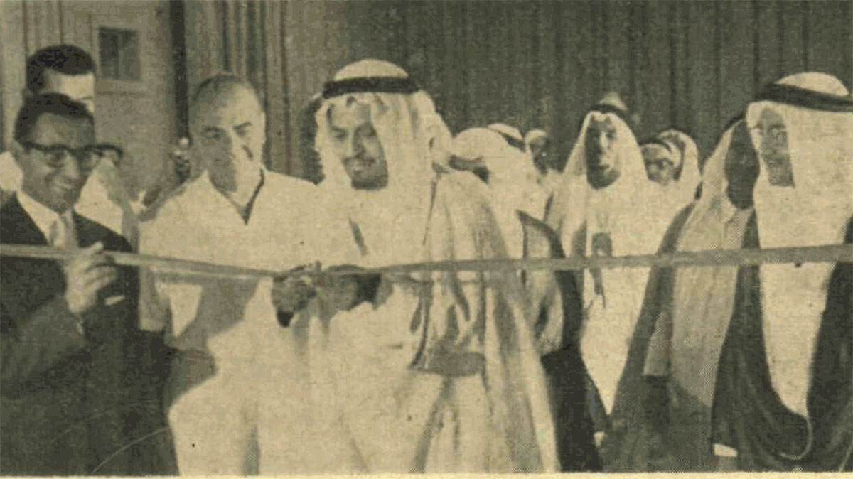At a formal opening on Sunday, Aug. 25, His Highness Amir 'Abd al-Mushin ibn Jiluwi, acting Governor of the Eastern Province, cuts the ribbon across the entrance of the Oil Exhibit Center in Dhahran.