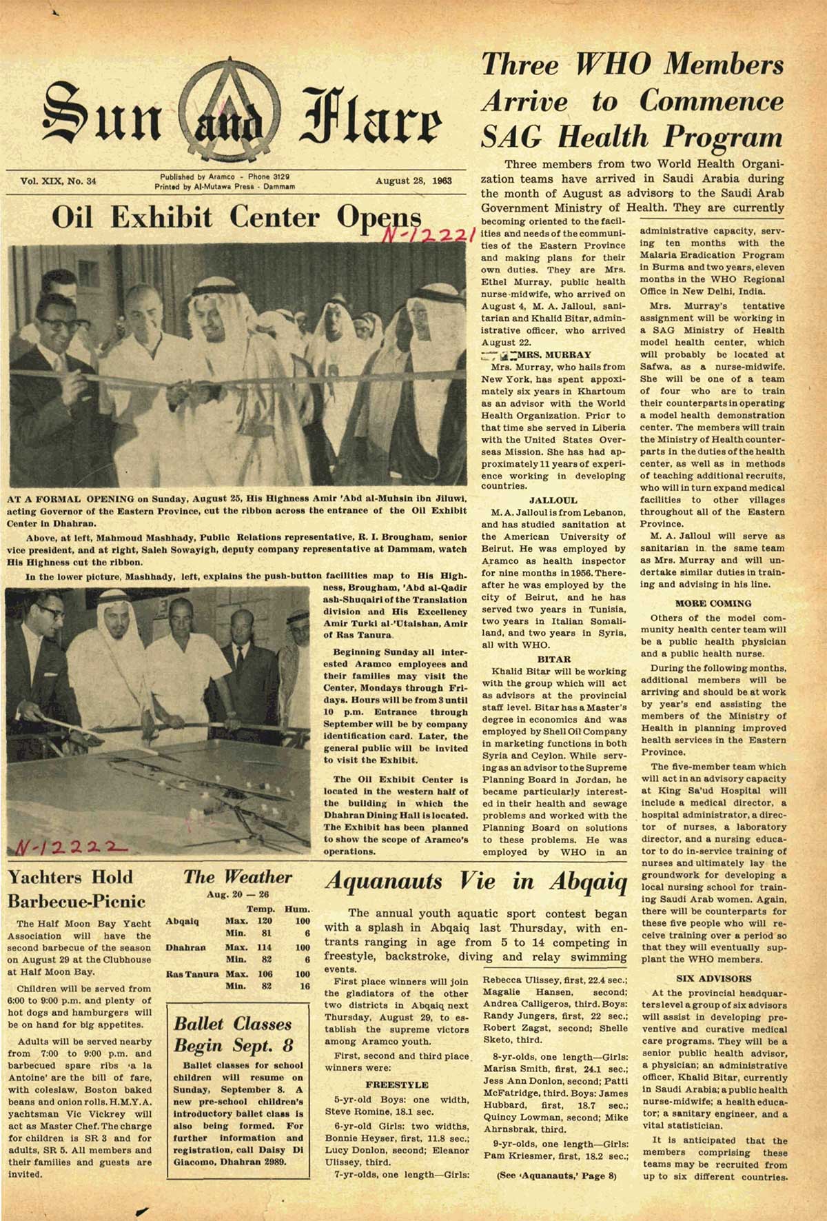 Beginning Sunday, all interested Aramco employees and their families may visit the Center, Mondays through Fridays. Hours will be from 3 to 10 p.m. Entrance through September will be by company identification card. Later, the general public will be invited to visit the Exhibit.